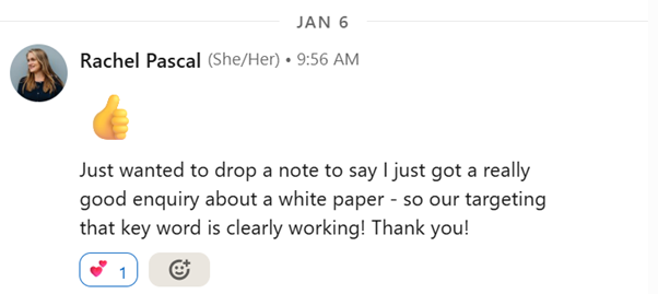 “I just got a really good enquiry about a white paper, so our targeting is clearly working! Thank you!”