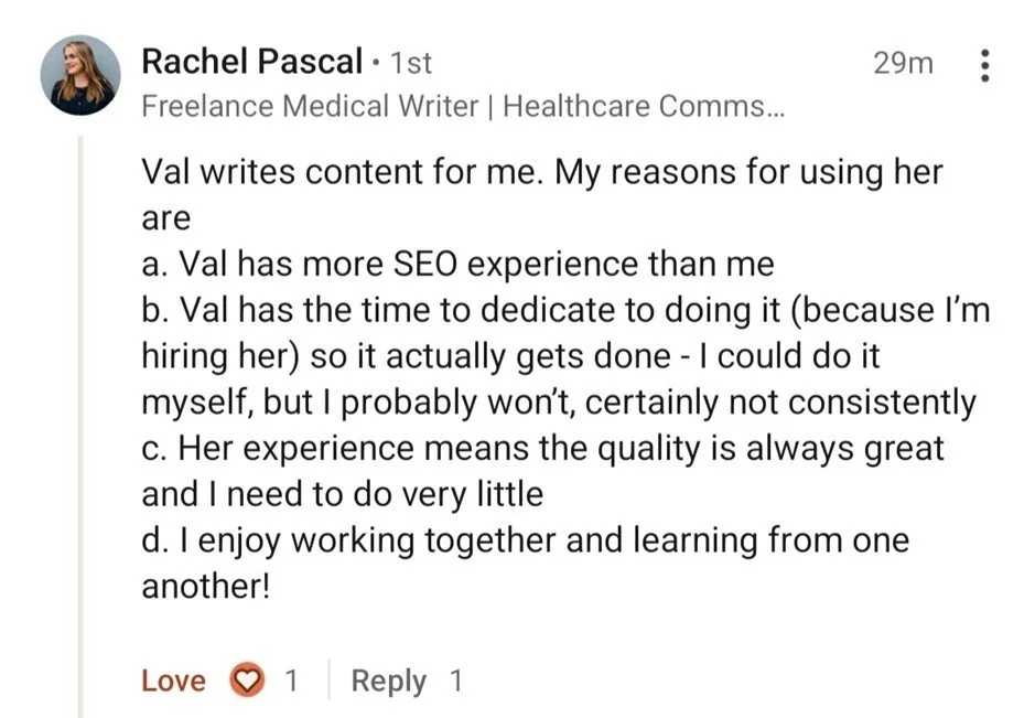 “Val has more SEO experience than me. Her experience means the quality is always great, and I need to do very little.”